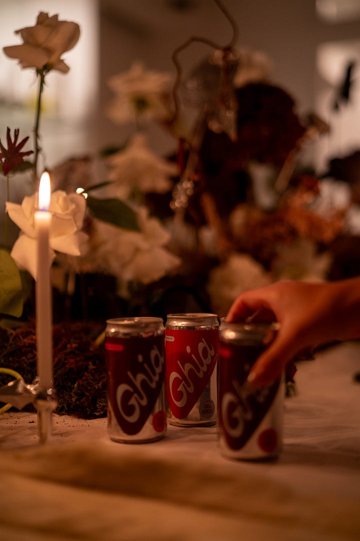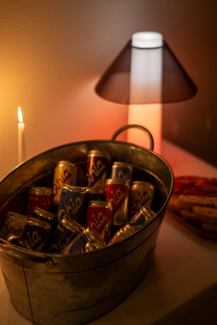 Tsk! Pshhht! That crisp crack of a can. It wouldn’t be a party without a choice beverage, and we couldn’t get enough of ours. Ghia’s charming cans littered the table, adding to our ambiance.