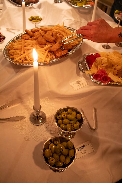 So for our night of extravagance and delights, we created the spread of all spreads. Potato chips and caviar. French fries and champagne. Pickles and charcuterie. Candy, cheese, and chocolate <3 mmmm. I had been dreaming of it all January.
